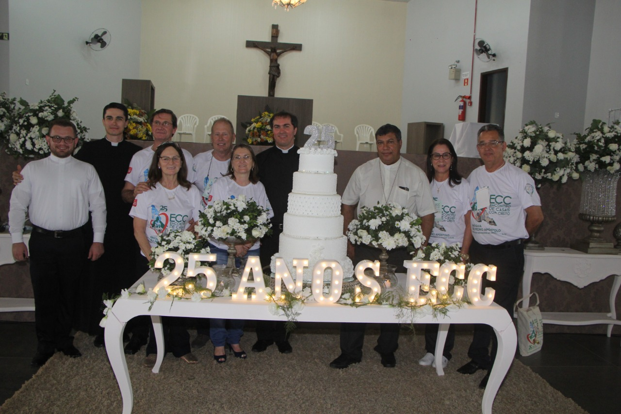 Diácono Jacson da Paroquia São Pedro de Sorriso/MT, Padre Bruno Diretor Espiritual Setorial, Casal Regional Oeste II 2018/2021 - Dionísio e Gilma Anese, Nivaldo e Ivanilde Martinello (casal Coordenador do evento), Padre Valdir Luiz Koch Pároco da Paroquia São Pedro e Diretor Espiritual dos 25 anos, Dom Benedito Gonçalves dos Santos (Bispo de Presidente Prudente Assistente Eclesiástico Nacional do ECC) e Antônio Bandeira e Cleide Assunção da Secretaria Nacional do ECC.