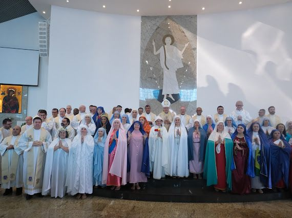 Celebrantes e mulheres representando todas as Nossas Senhoras em missa de 17/08/25