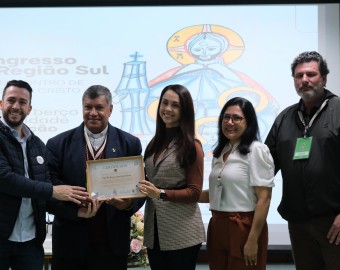 Leandro (representando o homenageado Felipe), Dom Benedito (Bispo da Diocese de Presidente Prudente), Tatiane (representando a homenageada Cleusa), Silvia Meurer e Paulo Meurer (casal coordenador geral do congresso da região Sul)