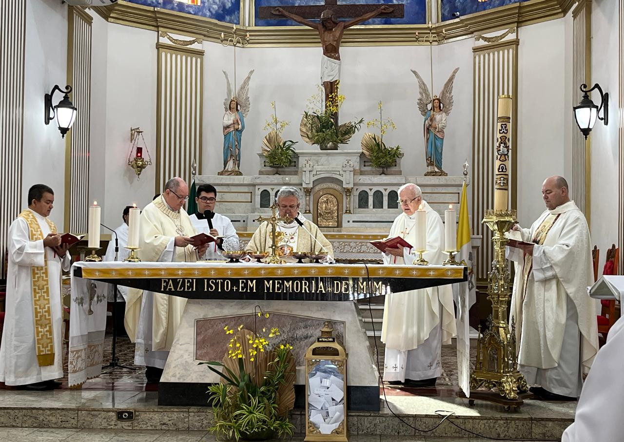 A Santa Missa do sábado dia 27 de abril de 2024, foi presidida por Dom Benedito Gonçalves dos Santos e concelebrada por Dom Adair José Guimarães, Assistente Eclesiástico Nacional, pelos Diretores Espirituais Regionais presentes e o Padre Luiz Laudino da Arquidiocese de Londrina, na Paróquia São José, neste dia contamos com as ilustres presenças de Dom Dimas Lara Barbosa Arcebispo de Campo Grande e do Padre André Márcio Nogueira de Souza. Tivemos neste dia a ilustre presença de Dom Benedito Gonçalves dos Santos, Bispo da Diocese de Presidente Prudente - SP, Padre Luiz Laudino da Arquidiocese de Londrina-PR, e do casal Marcos e Regina da Arquidiocese de Londrina-PR, que vieram nos falar sobre "Padre Alfonso Pastore, espiritualidade, missionariedade, e o processo de beatificação”.