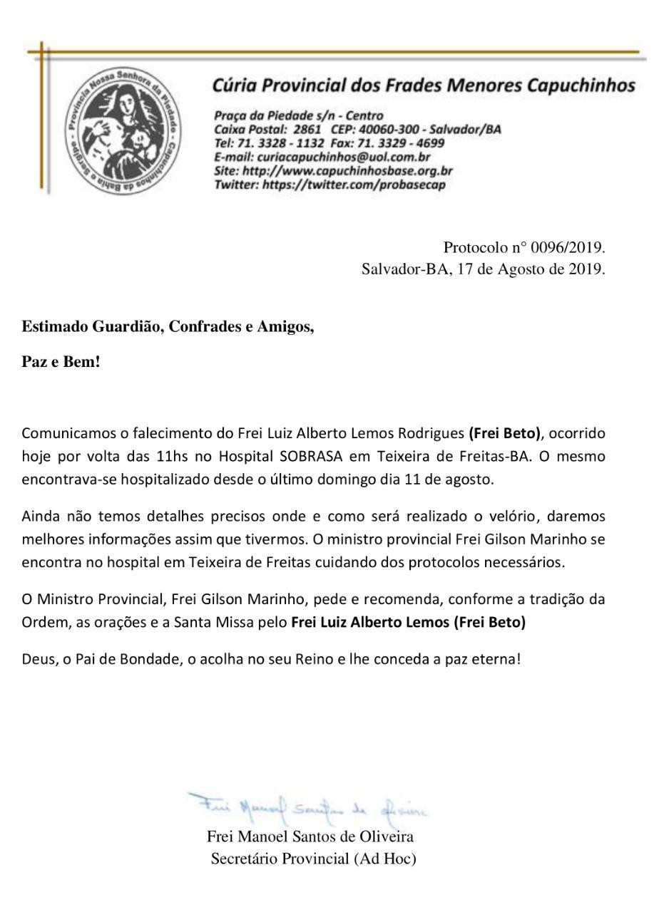 Nota de Falecimento Frei Beto